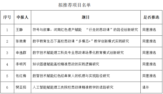 根据教务处《关于开展 2025 年河南工程学院高等教育教学改革研究与实践项目立项工作的通知》的要求,马克思主义学院积极开展相关工作,鼓励教师积极申报,组织专家对申报书进行了匿名评审。经个人申报、专家评审,学院研究同意,现对拟推荐项目名单予以公示。公示时间为2025年10月21日至10月23日。